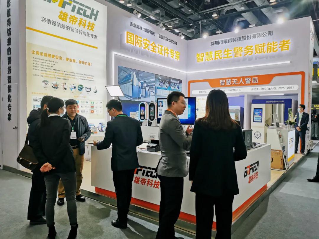 雄帝科技以信息化、智能化手段改革服務模式,大膽創新,打造集戶政、出入境、交管等多警種綜合業務的“一站式”智慧無人警局:戶政、交管、出入境三警業務一機通辦的《智慧警務綜合服務終端》、懸浮式升降、鏡中像《證件照相機》、60秒制證的《車證自助一體機》,提供了“群眾便捷、民警賦能”的智慧警務民生服務,吸引了眾多觀展嘉賓參觀交流。