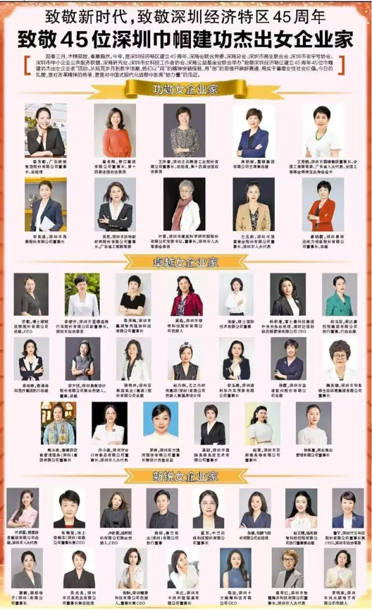 適值深圳經濟特區建立45周年之際,深商會聯合黨委、深商總會、深圳市商業聯合會、深圳市老字號協會、深圳市中小企業公共服務聯盟、深商研究會、深圳市女科技工作者協會及深商公益基金會,共同主辦了《致敬深圳經濟特區建立45周年45位巾幗建功杰出女企業家》活動。3月4日,深圳商報以專題形式聚焦這一盛事,向為特區高質量發展注入強勁動力的女性領軍者致敬。
