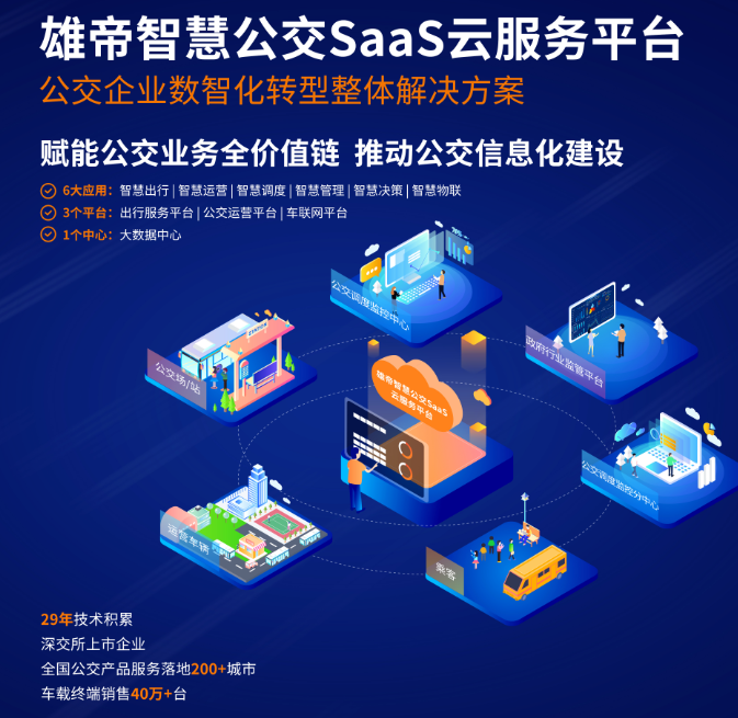 雄帝憑借在公交領域多年的行業積淀,致力于推廣智慧公交整體解決方案,將公共交通業務從多元聚合支付拓展到智慧調度、智慧運營、主動安全、客流分析、智慧場站等領域,其中公交支付業務已覆蓋全國200多個城市,SaaS服務模式覆蓋40多個城市公交。并基于公交全業務的數據中臺能力,打造推出智慧公交SaaS云服務平臺產品,為客戶提供核心業務支撐的同時,助力公交解決方案的互聯網轉型與數字化升級!